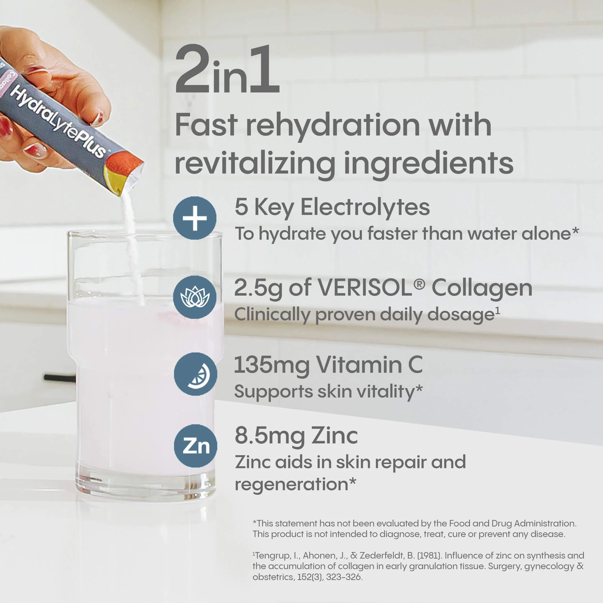 This functional electrolyte formula delivers clinically proven ingredients for hair, skin, and nails. It features a daily dose of VERISOL® Collagen, along with vitamin C and zinc for a layered approach to your daily glow.